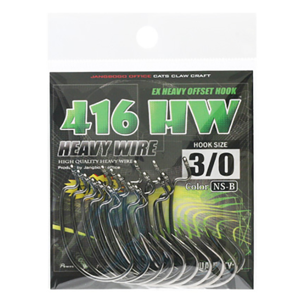 파워 피싱을 위한 헤비 와이어훅. 기존 훅 와이어의 굵기 보다 3단계 UP된 와이어의 채택. PE라인에 의한 헤비 텍사스 등 파워피싱을 초월한 스타일에 적합하도록 설계된 최상의 훅. 인장력과 비틀림 강도를 자랑하는 416HW HOOK.